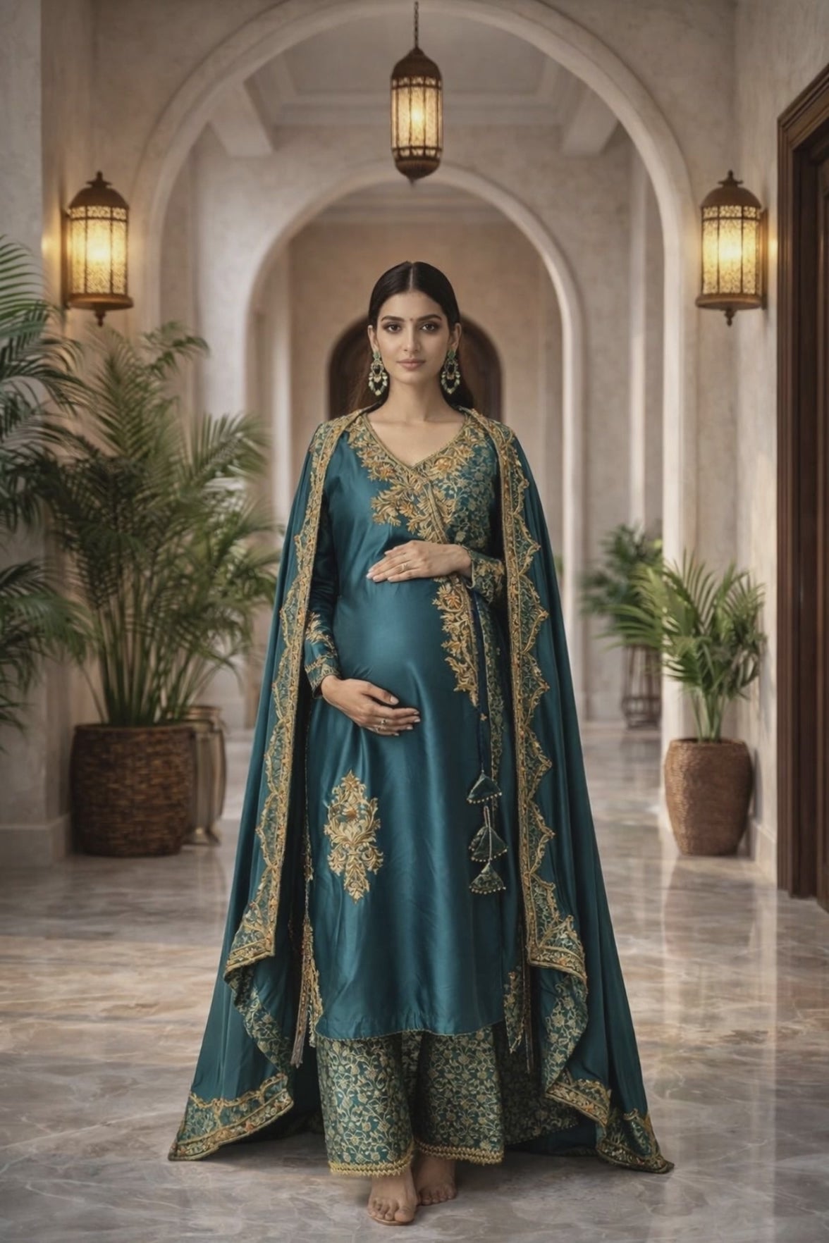 Crafted in rich teal silk and adorned with intricate antique gold embroidery, this maternity ensemble is designed to celebrate motherhood with elegance and poise. The flowing dupatta and detailed back motif create a regal silhouette — timeless, refined, and effortlessly powerful.